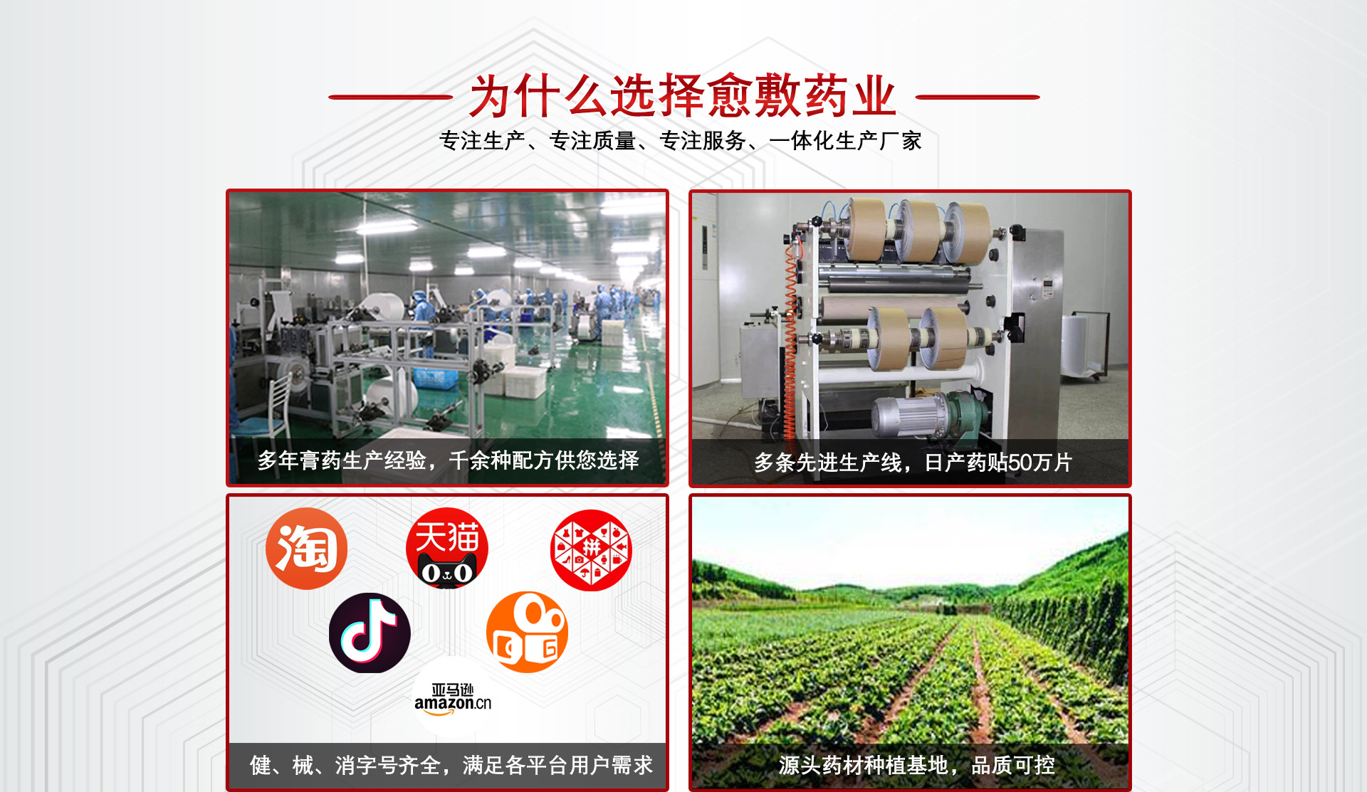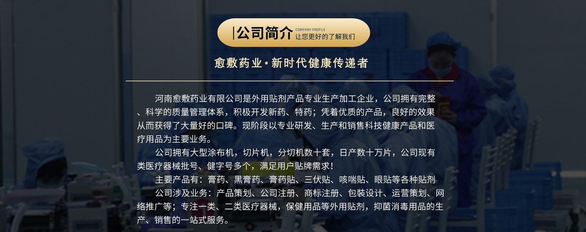 主要產(chǎn)品有:膏藥、黑膏藥、膏藥貼、三伏貼、咳喘貼、眼貼等各種貼劑公司涉及業(yè)務(wù):產(chǎn)品策劃、公司注冊、商標(biāo)注冊、包裝設(shè)計(jì)、運(yùn)營策劃、網(wǎng)絡(luò)推廣等;專注一類、二類醫(yī)療器械,保健用品等外用貼劑,抑菌消毒用品的生產(chǎn)、銷售的一站式服務(wù)。
