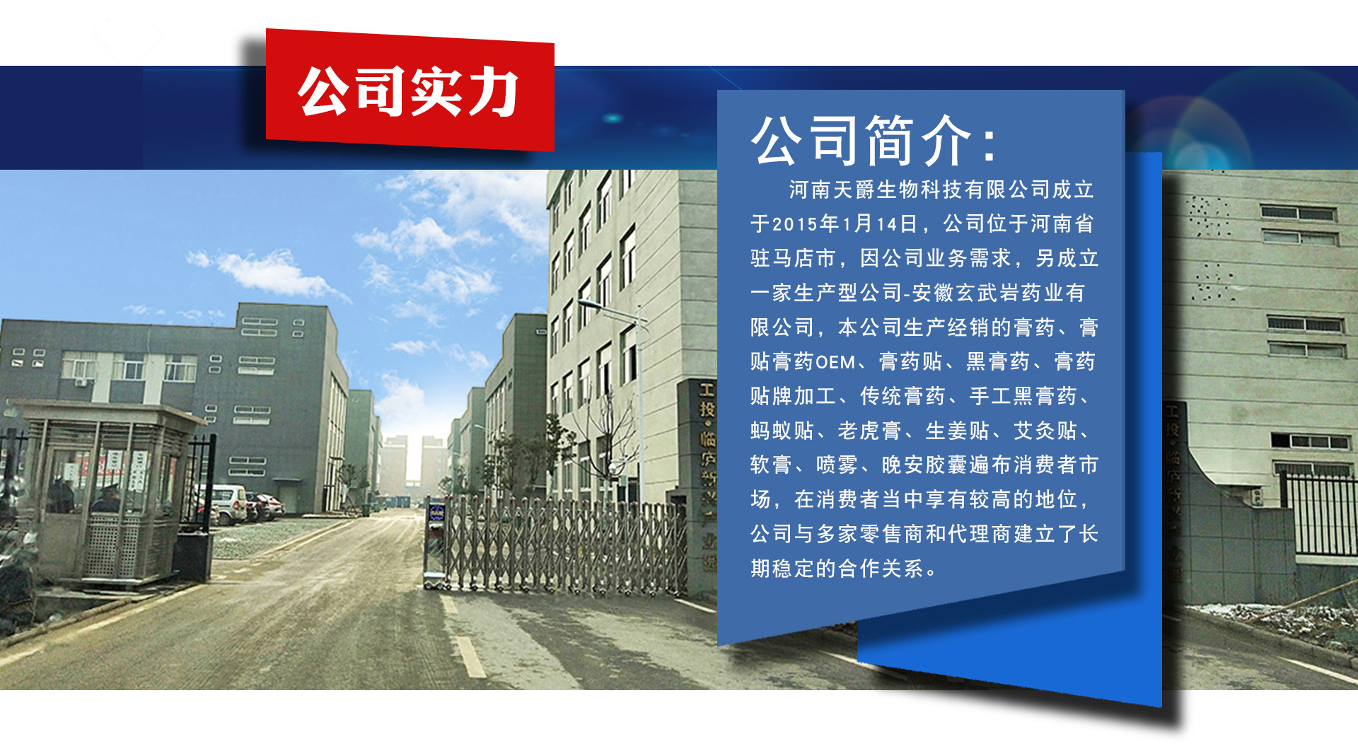 河南天爵生物科技有限公司成立于2015年1月14日,公司位于河南省駐馬店市,因公司業(yè)務(wù)需求,另成立一家生產(chǎn)型公司-安徽玄武巖藥業(yè)有限公司, 本公司生產(chǎn)經(jīng)銷的膏藥、膏貼、膏藥OEM、膏藥貼、黑膏藥、膏藥貼牌加工、傳統(tǒng)膏藥、手工黑膏藥、螞蟻貼、老虎膏、生姜貼、艾灸貼、軟膏、噴劑、失眠晚安膠囊暢銷消費(fèi)者市場(chǎng),在消費(fèi)者當(dāng)中享有較高的地位,公司與多家零售商和代理商建立了長(zhǎng)期穩(wěn)定的合作關(guān)系。 河南天爵生物科技有限公司經(jīng)銷的膏藥、膏貼、膏藥OEM、膏藥貼、黑膏藥、膏藥貼牌加工、傳統(tǒng)膏藥、手工黑膏藥、螞蟻貼、老虎膏、生姜貼、艾灸貼、軟膏、噴劑、失眠晚安膠囊品種齊全、價(jià)格合理。河南天爵生物科技有限公司和安徽玄武巖藥業(yè)有限公司實(shí)力雄厚,重信用、守合同、保證產(chǎn)品質(zhì)量,以多品種經(jīng)營(yíng)特色和薄利多銷的原則,贏得了廣大客戶的信任。