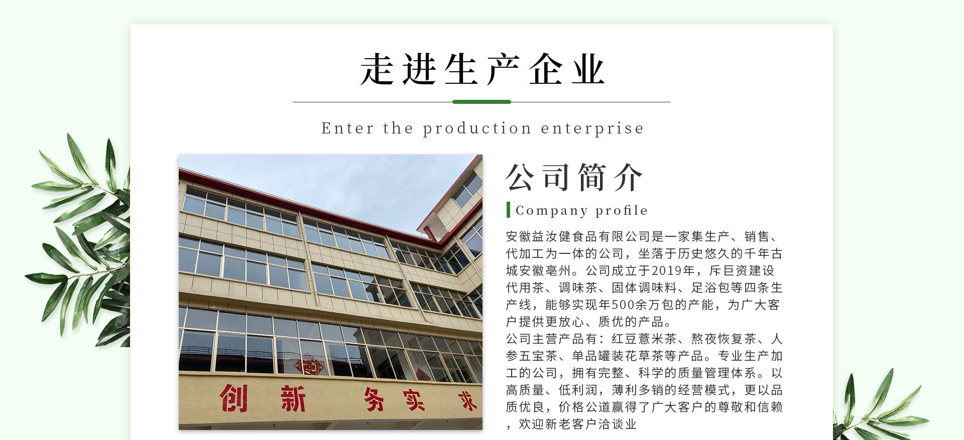 安徽益汝健食品有限公司是紅豆薏米茶、熬夜恢復茶、組合花茶、罐裝花茶、袋泡茶等產品專業(yè)生產加工的公司,擁有完整、科學的質量管理體系。安徽益汝健食品有限公司的誠信、實力和產品質量獲得業(yè)界的認可。歡迎各界朋友蒞臨參觀、指導和業(yè)務洽談。