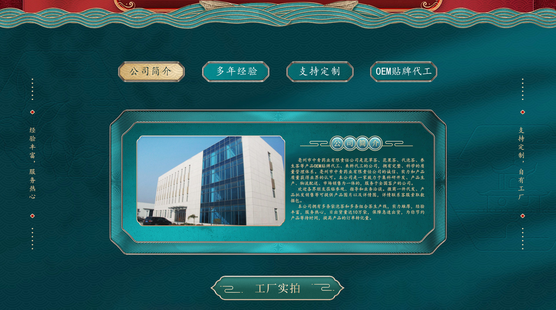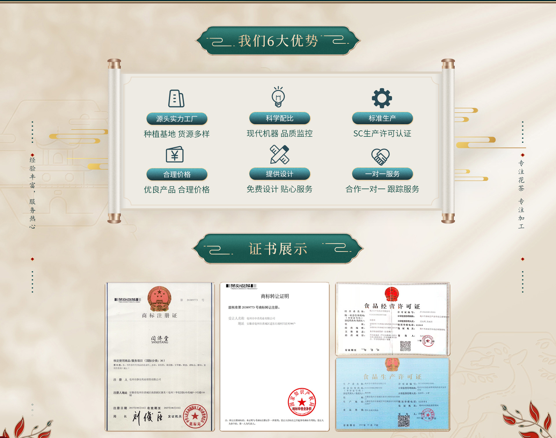 亳州市中青藥業(yè)有限責(zé)任公司是花草茶、花果茶、代泡茶、養(yǎng)生茶等產(chǎn)品專業(yè)生產(chǎn)加工的公司,擁有完整、科學(xué)的質(zhì)量管理體系。本公司坐落于有”藥材之都‘’華佗故鄉(xiāng)“的名醫(yī)華佗之鄉(xiāng)。亳州市中青藥業(yè)有限責(zé)任公司的誠信、實(shí)力和產(chǎn)品質(zhì)量獲得業(yè)界的認(rèn)可。本公司是一家致力于集科研開發(fā)、產(chǎn)品生產(chǎn)、物流配送、市場銷售為一體的,服務(wù)于全國客戶的公司。歡迎各界朋友蒞臨參觀、指導(dǎo)和業(yè)務(wù)洽談。