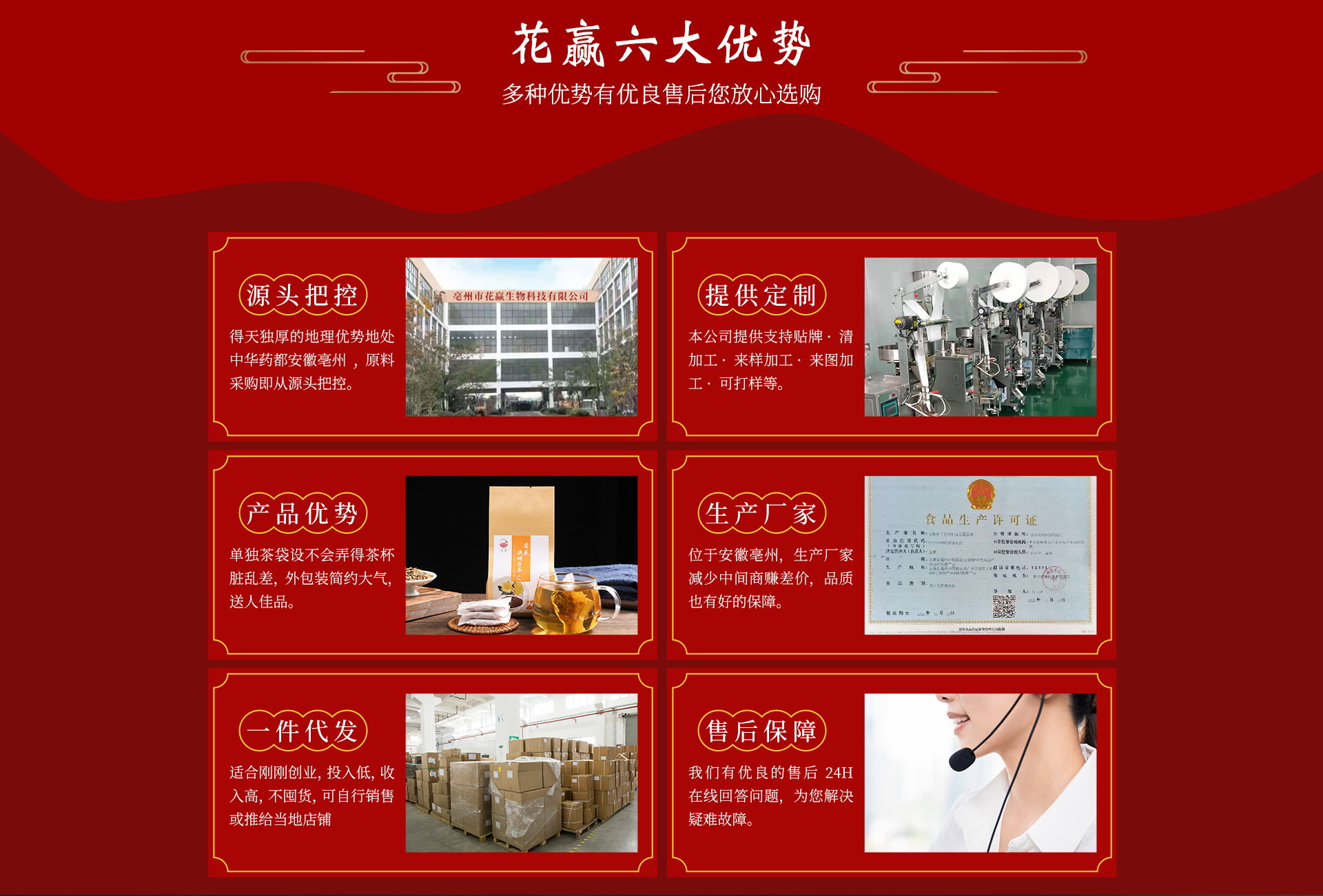 亳州市花贏生物科技有限公司是一家生產(chǎn)加工為一體的生產(chǎn)型企業(yè),公司位于四大藥都之首安徽-亳州,廠區(qū)環(huán)境優(yōu)美、物流便捷,標(biāo)準(zhǔn)化SC生產(chǎn)車間,完善的質(zhì)量管理體系,公司現(xiàn)有員工86人,其中研發(fā)人員3人,檢驗員3人,化驗員2人,公司主營:代用茶、調(diào)味茶、組合花茶等,秉承:誠信經(jīng)營、質(zhì)量第一的原則取得廣大客戶的信賴與支持,亳州市花贏生物科技有限公司歡迎新老客戶前來洽談與指導(dǎo)。