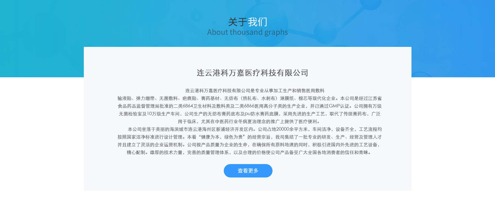 連云港科萬嘉醫(yī)用敷料有限公司是經(jīng)過江蘇省食品藥品監(jiān)督管理局批準的二類6864衛(wèi)生材料及敷料類及二類6866醫(yī)用高分子類的生產(chǎn)企業(yè)。并已通過GMP認證。公司擁有萬級無菌檢驗室及10萬級生產(chǎn)車間。主要產(chǎn)品有特種規(guī)格無紡布、無紡布膠帶、