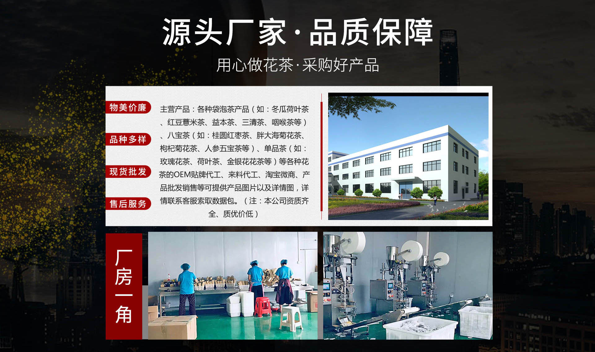 我工廠常年代工各類花草茶,袋泡茶,組合茶,OEM貼牌代加工,量大從優(yōu),歡迎各界人士咨詢洽談