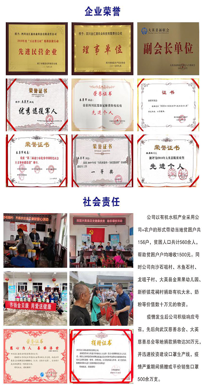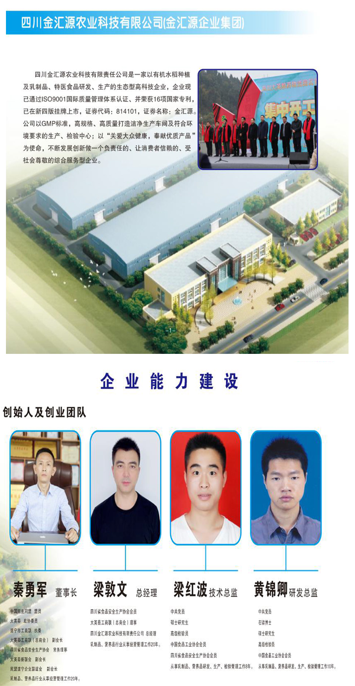 四川金匯源農(nóng)業(yè)科技有限責任公司是一家以有機水稻種植及乳制品、特醫(yī)食品研發(fā)、生產(chǎn)的生態(tài)型高科技企業(yè),企業(yè)現(xiàn)已通過ISO9001國際質(zhì)量管理體系認證、并榮獲16項國家專利,已在新四版掛牌上市,證券代碼:814101,證券名稱:金匯源。公司以GMP標準,高規(guī)格、高質(zhì)量打造潔凈生產(chǎn)車間及符合環(huán)境要求的生產(chǎn)、檢驗中心;以“關愛大眾健康,奉獻優(yōu)質(zhì)產(chǎn)品”為使命,不斷發(fā)展創(chuàng)新做一個負責任的、讓消費者信賴的、受社會尊敬的綜合服務型企業(yè)。