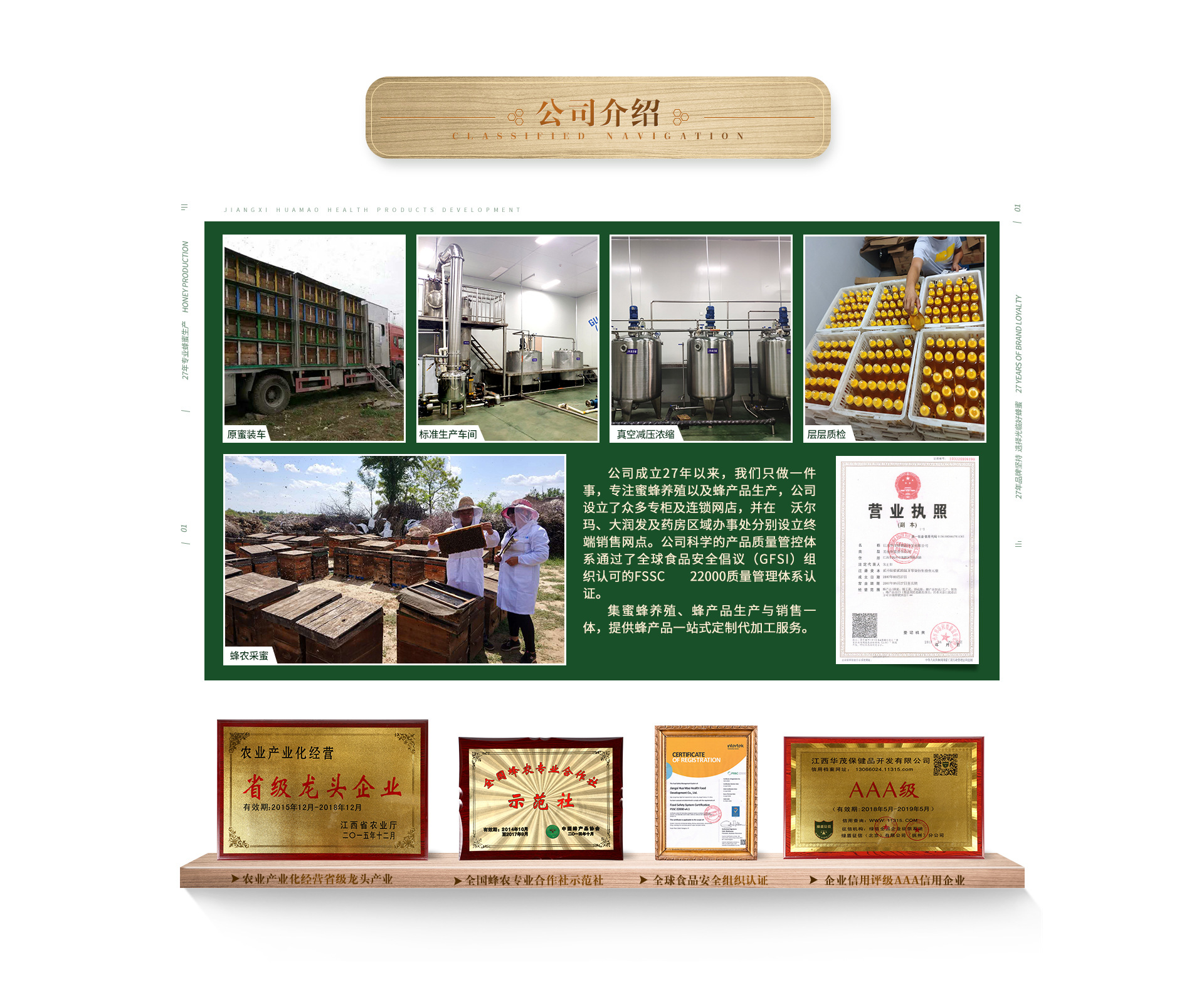 江西華茂保健品開發(fā)有限公司創(chuàng)建于1992年,是一家集蜜蜂養(yǎng)殖、蜂產(chǎn)品生產(chǎn)與銷售為一體的綜合性公司。 公司始終堅持“取之于自然,奉獻(xiàn)于人類”的企業(yè)理念;堅持質(zhì)量優(yōu)先,顧客至上的經(jīng)營宗旨。建立了企業(yè)十基地十蜂業(yè)合作社十蜂農(nóng)的完整的全產(chǎn)業(yè)供應(yīng)鏈。 公司擁有先進(jìn)的生產(chǎn)設(shè)備和信息化管理系統(tǒng)及實(shí)力雄厚的科研技術(shù)隊(duì)伍,具備完善的檢測檢驗(yàn)手段和質(zhì)量管控能力,并依托南昌大學(xué)、江西農(nóng)大、江西蜂產(chǎn)品研究所等科研單位的技術(shù)支持,科企聯(lián)手,致力于為消費(fèi)都提供高質(zhì)的蜂產(chǎn)品。 1、1992年,江西華茂實(shí)業(yè)公司成立,主營蜂產(chǎn)品出口東南亞業(yè)務(wù) 2、1997年,啟動蜂產(chǎn)品內(nèi)銷業(yè)務(wù) 3、1998年,發(fā)起成立“江西省撫州市臨川區(qū)養(yǎng)蜂協(xié)會” 4、2007年,公司改制為民營企業(yè),正式更名為“江西華茂保健品開發(fā)有限公司” 5、2007年,組織成立“撫州市臨川區(qū)華豐蜂業(yè)專業(yè)合作社” 6、2014年,建成占地50畝現(xiàn)代化辦公廠房并完成搬遷