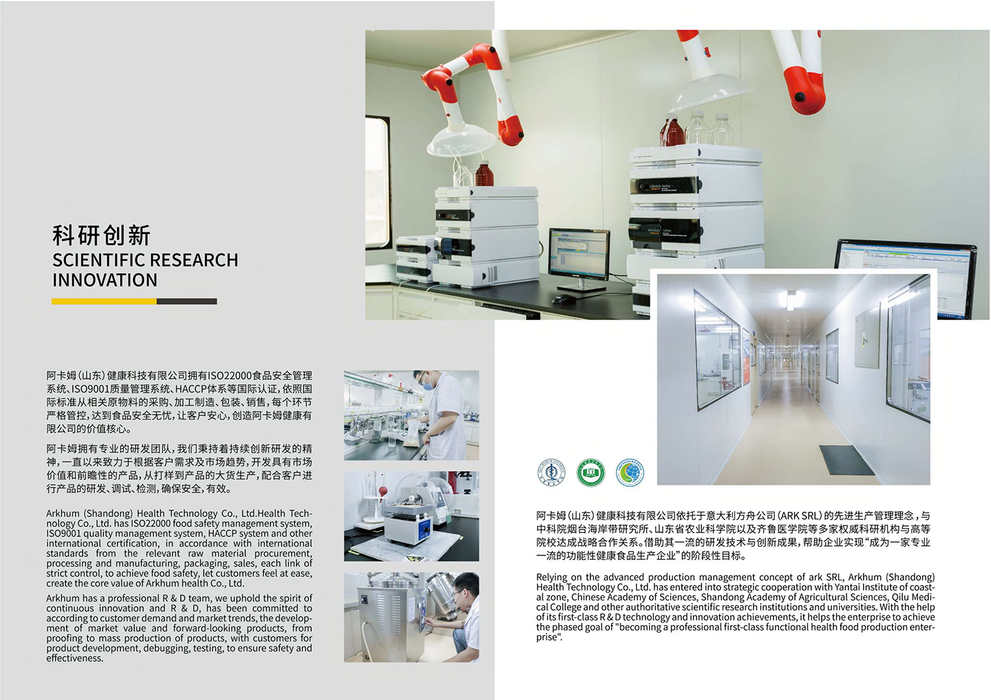 阿卡姆(山東)健康科技有限公司依托于意大利方舟公司(ARK SRL)的先進(jìn)生產(chǎn)管理理念,與中科院煙臺海岸帶研究所、山東省農(nóng)業(yè)科學(xué)院以及齊魯醫(yī)學(xué)院等多家權(quán)威科研機構(gòu)與高等院校達(dá)成戰(zhàn)略合作關(guān)系。借助其一流的研發(fā) 技術(shù)與創(chuàng)新成果,幫助企業(yè)實現(xiàn)“成為一家專業(yè)一流的功能性健康食品生產(chǎn)企業(yè)”的階段性目標(biāo)。