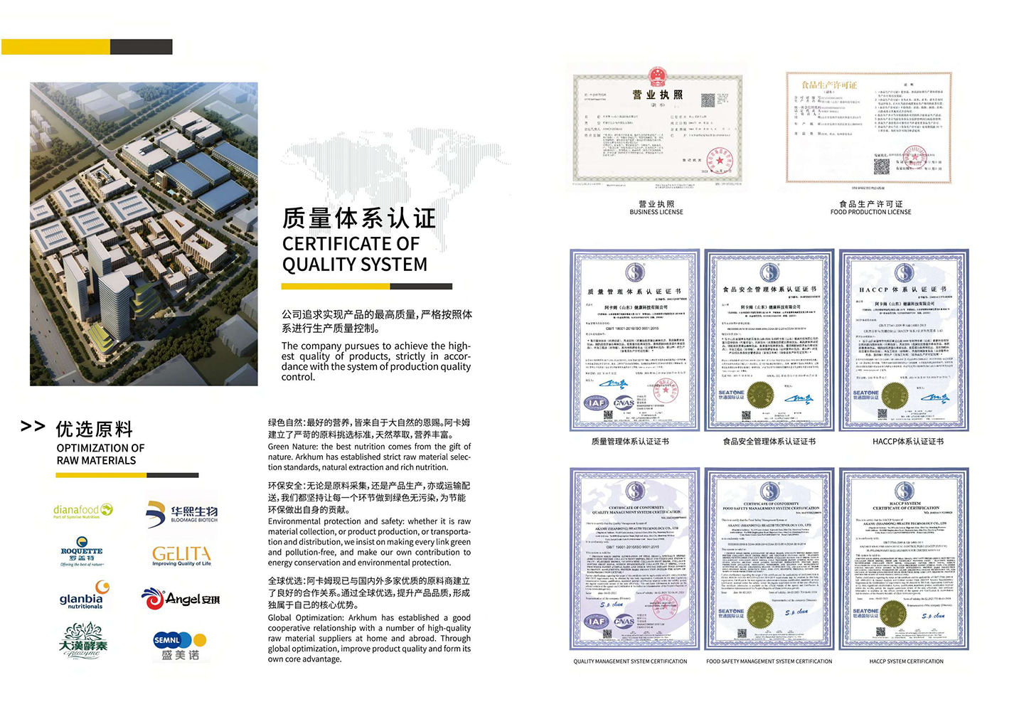 阿卡姆(山東)健康科技有限公司擁有ISO22000食品安全管理系統(tǒng)、IS09001質(zhì)量管理系統(tǒng)、HACCP體系等國際認(rèn)證,依照國際標(biāo)準(zhǔn)從相關(guān)原物料的采購、加工制造、包裝、銷售,每個環(huán)節(jié)嚴(yán)格管控,達(dá)到食品安全無憂,讓客戶安心,創(chuàng)造阿卡姆健康有限公司的價值核心。