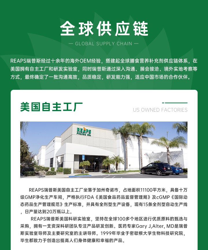 瑞普斯擁有豐富的全球原料資源,并堅持在全球100多個地區(qū)進行優(yōu)質(zhì)原料的采購。瑞普斯擁有美國自主工廠及研發(fā)實驗室,聘請資深科研團隊,對接各國知名研發(fā)機構(gòu),共同研發(fā)產(chǎn)品。此外,瑞普斯的貨運清關速度也屬于行業(yè)領航水平。
