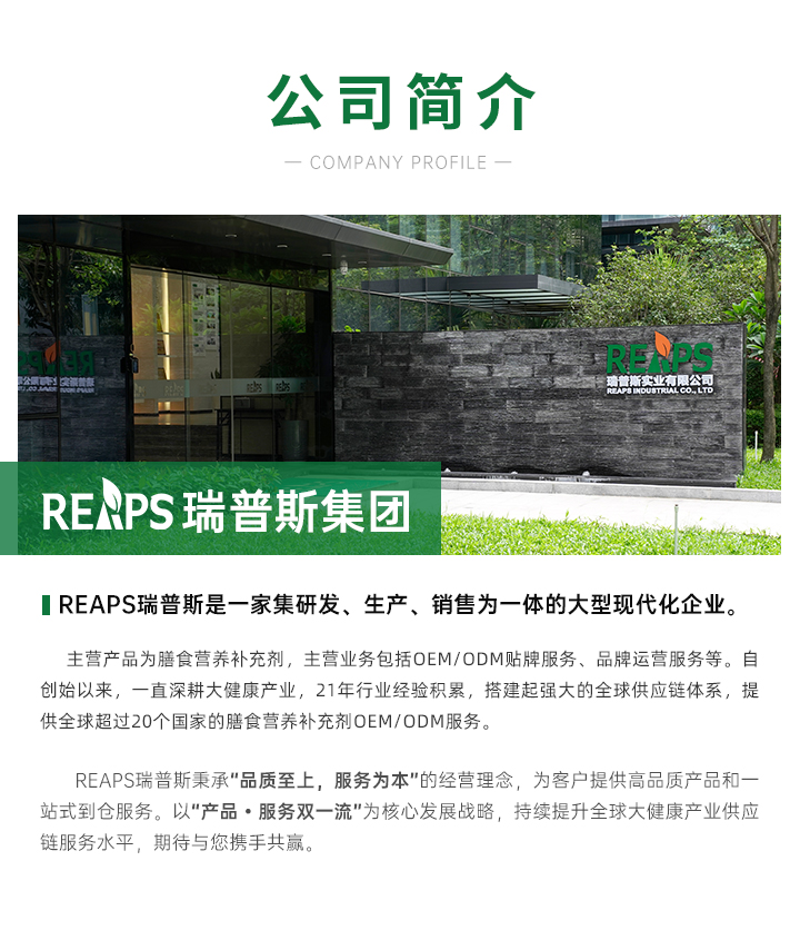 瑞普斯(深圳)實業(yè)有限公司是一家集研發(fā)、生產(chǎn)、銷售為一體的大型現(xiàn)代化企業(yè),主營產(chǎn)品為膳食營養(yǎng)補充劑,主營業(yè)務包括OEM/ODM貼牌服務、品牌運營服務等。自創(chuàng)始以來,一直深耕大健康產(chǎn)業(yè),21年行業(yè)經(jīng)驗積累,始終致力于服務和發(fā)展更具有社會價值的優(yōu)質(zhì)品牌,鏈接全球大健康優(yōu)質(zhì)資源,為大健康產(chǎn)業(yè)提供全球供應鏈解決方案及品牌運營服務。